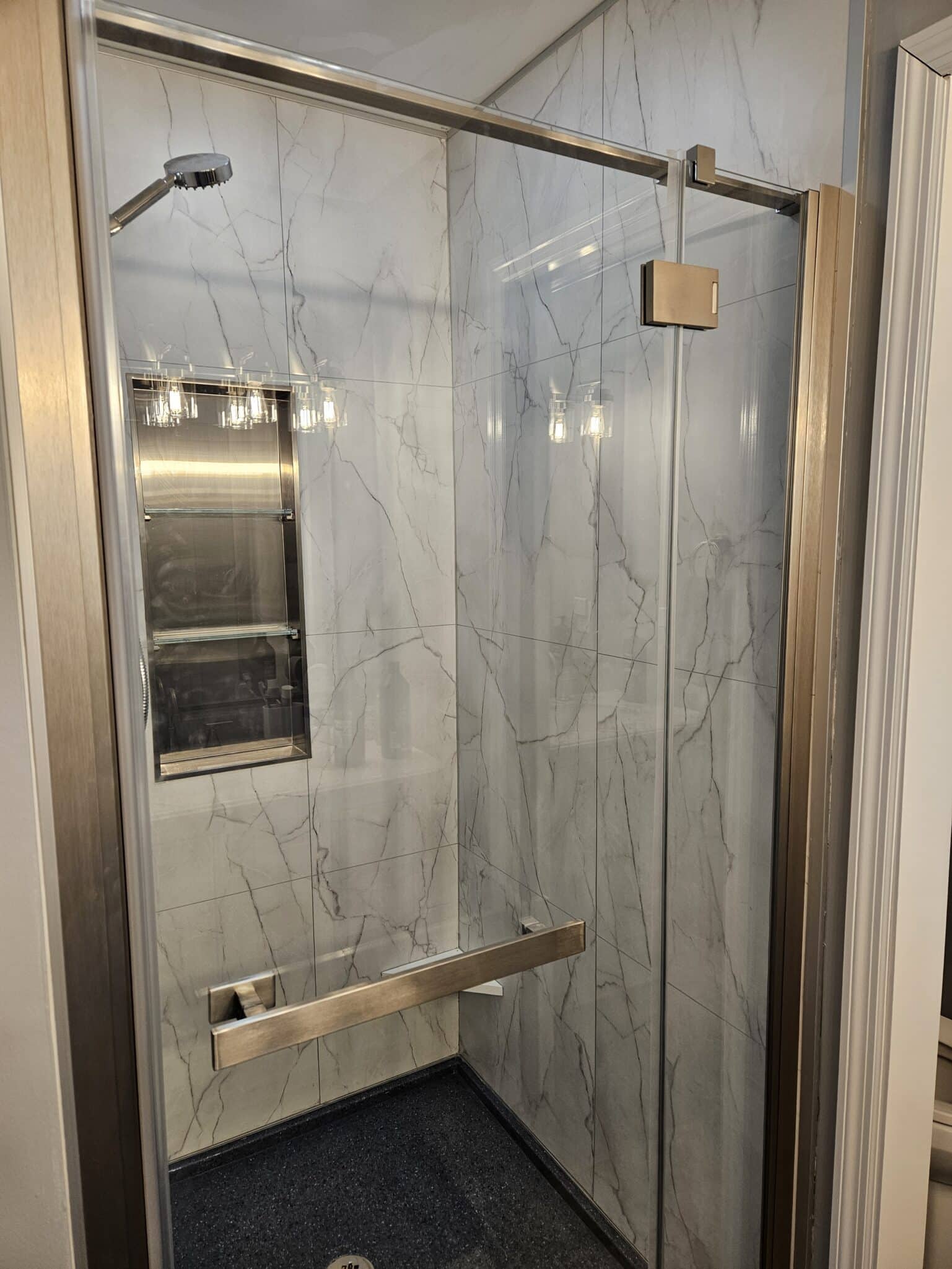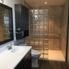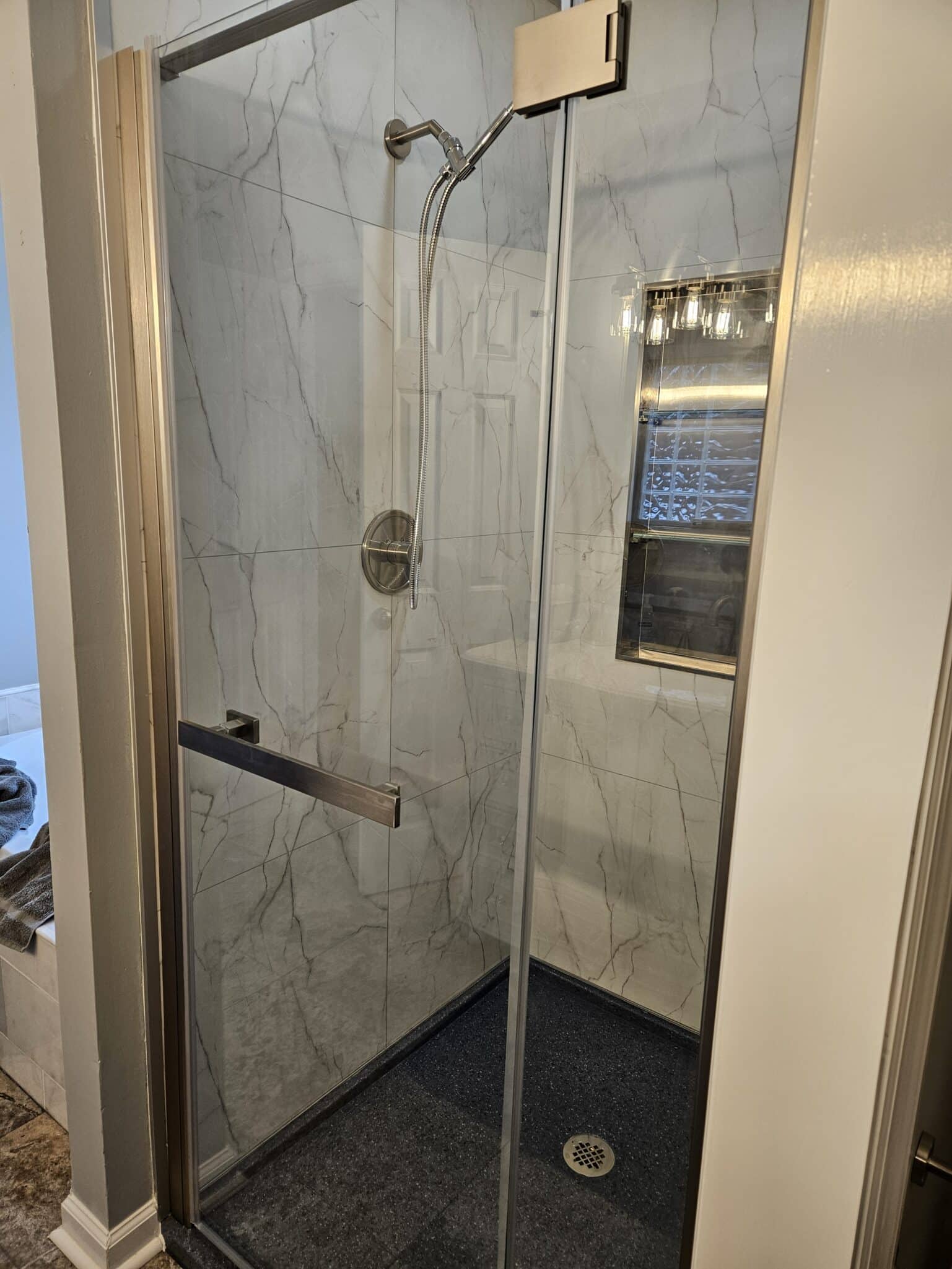 A great option for a doorless entry would to be considered a glass block shower wall. If interested, contact our ‘sister’ company, Eastern Glass Block.