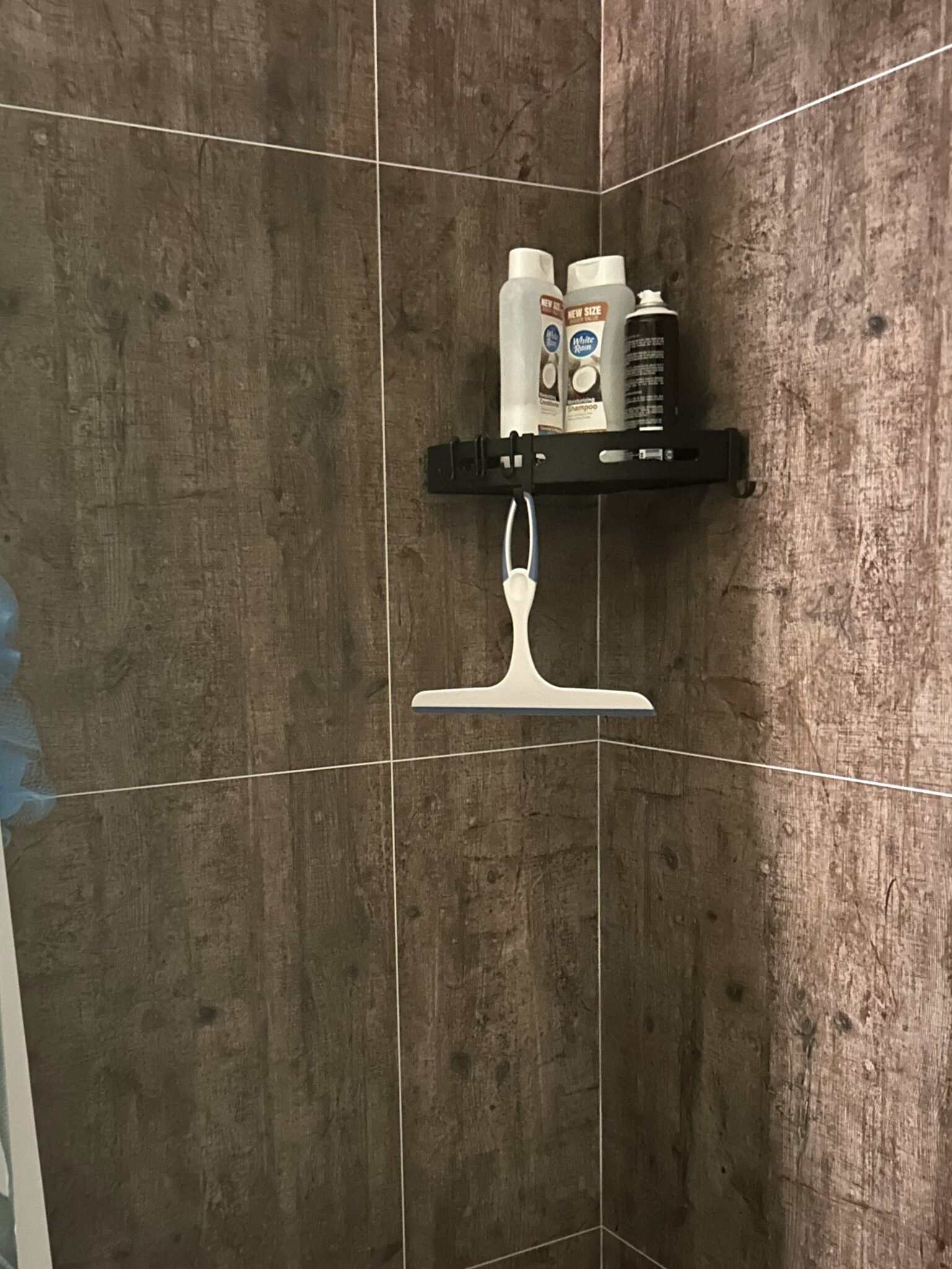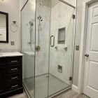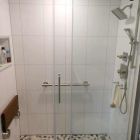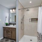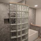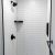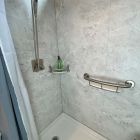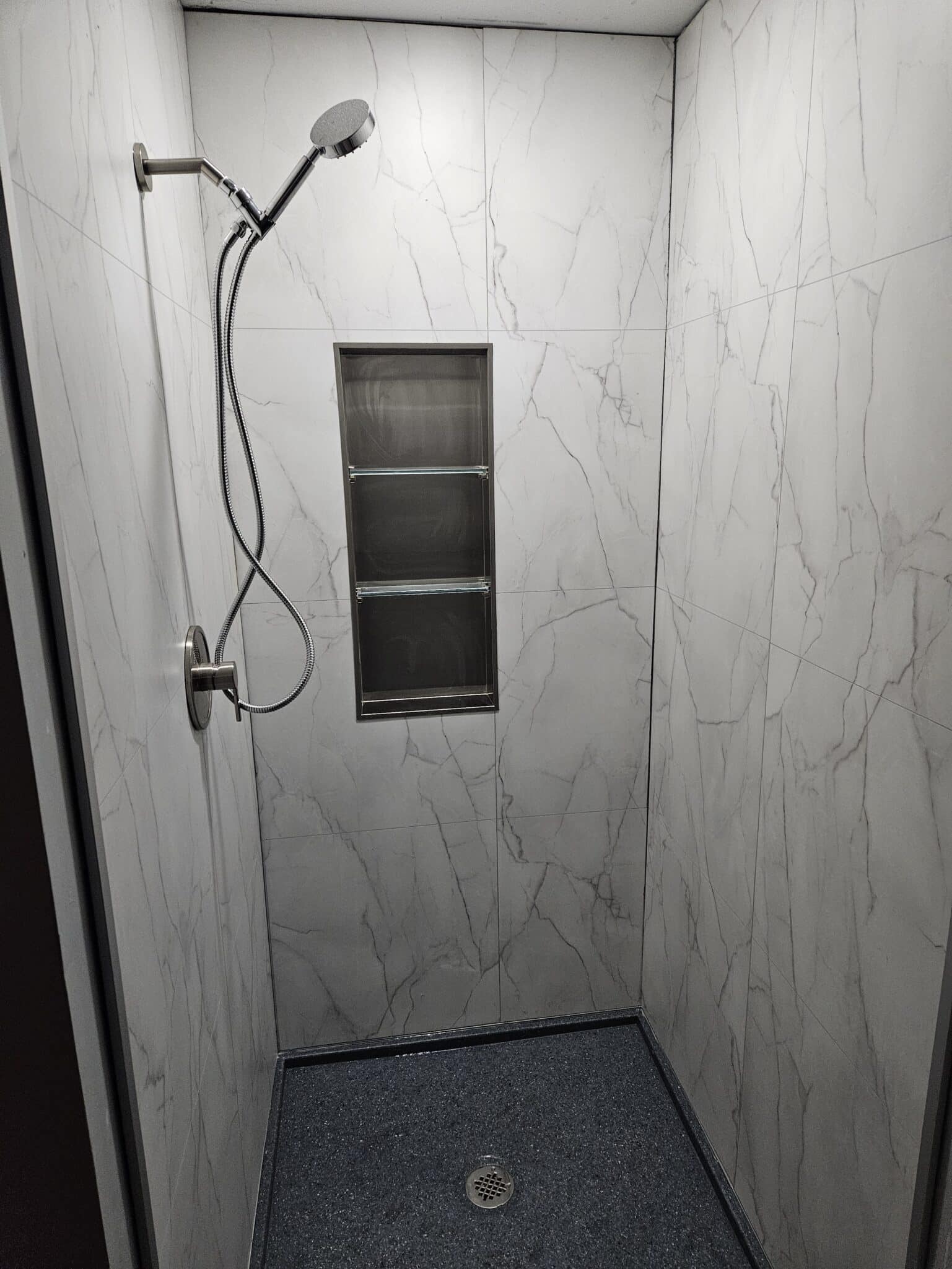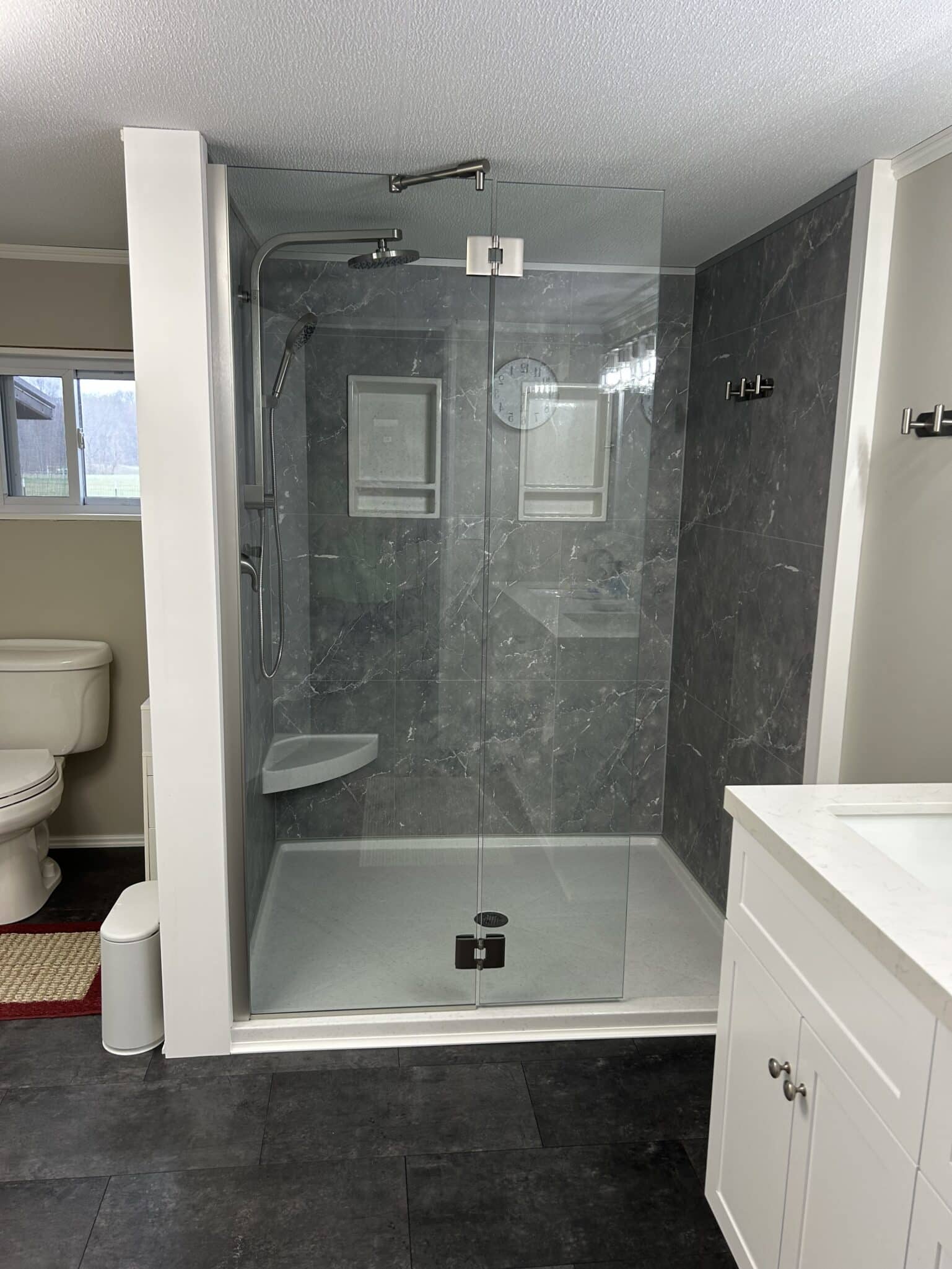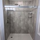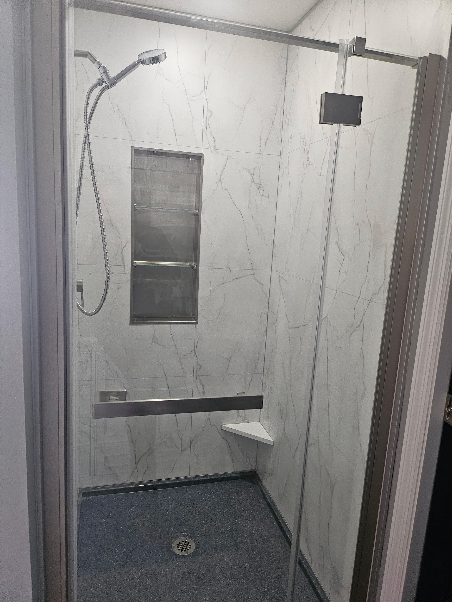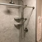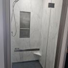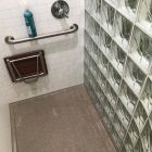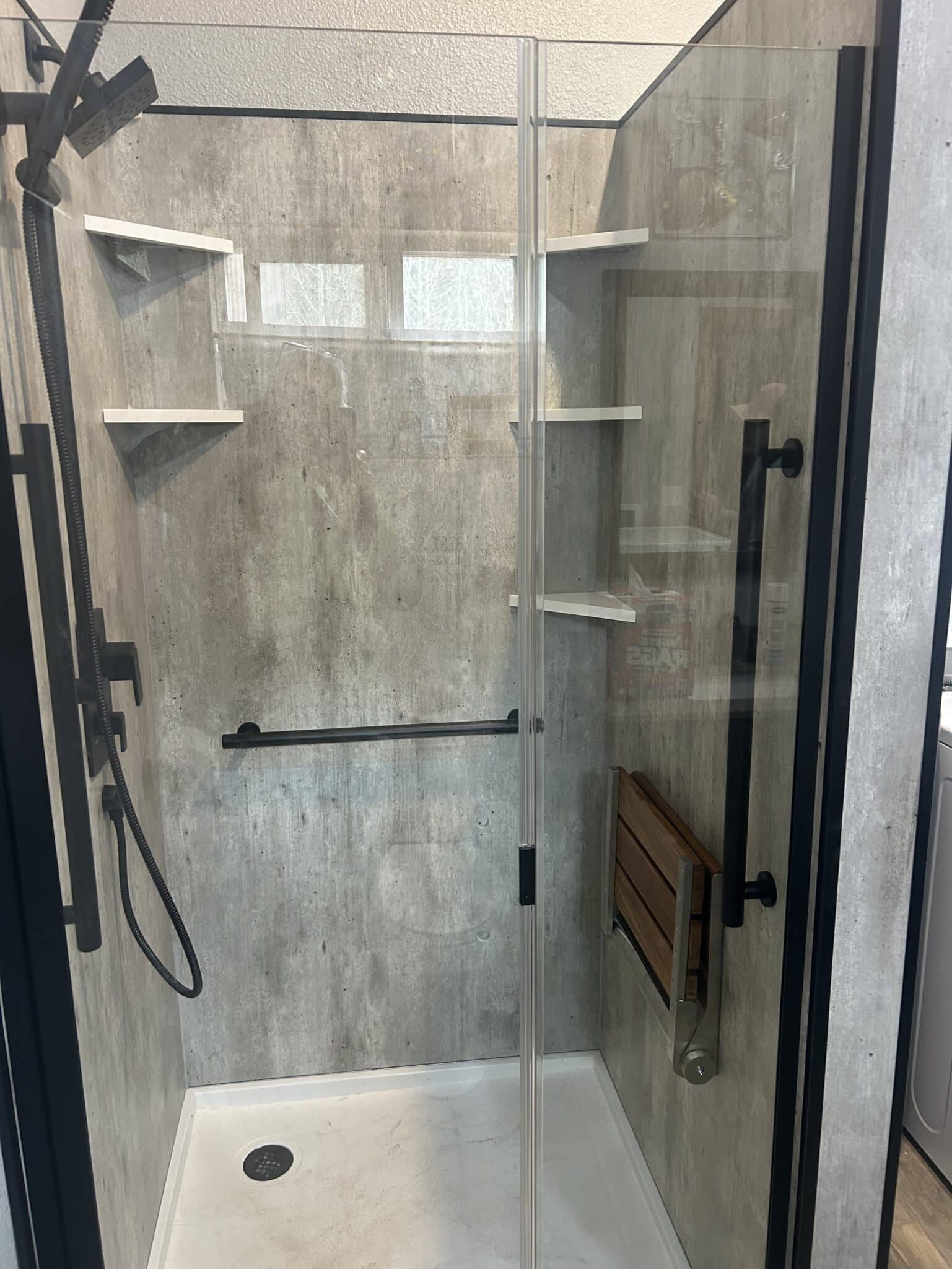 Cracked Cement with grab bars, corner shelves, and fold down seat.
