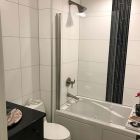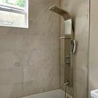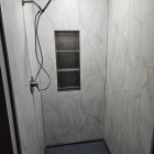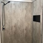 100% waterproof Fibo laminate shower wall panels are joined with a patented Aqualock click system and sealant – nearly invisible seams between panels.