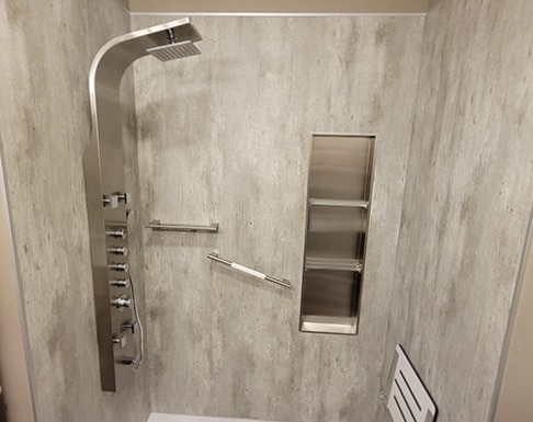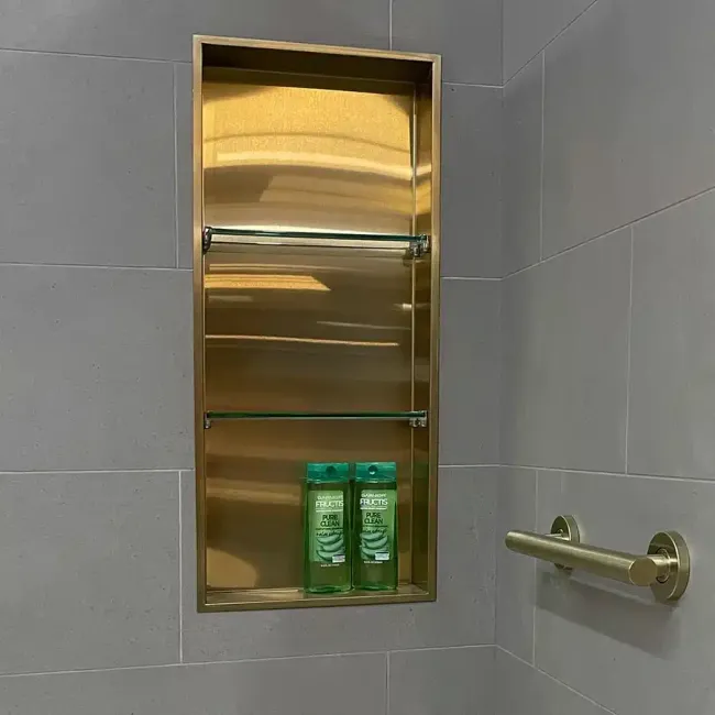 We offer a line of beautiful, sturdy 18- gauge stainless steel niches. These new recessed niches function as a rust-free compartment for storage of your shampoos, conditioners, and soaps. Available in 11 different finishes to coordinate with your shower wall panel pattern/color. These are also available in different orientations (horizontal & vertical) as well as different sizes. These are not your grandma’s old school caddies.