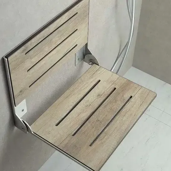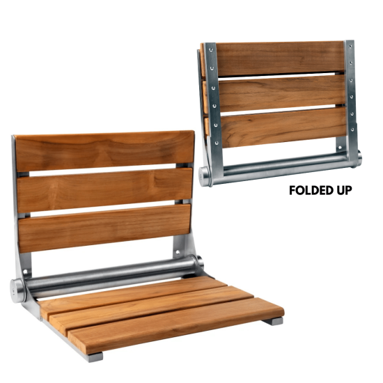 This 20” wide x 16” deep x 15 ¾” high teak seat has a 600 lb. load capacity. The wood slats are 1” thick and made of finished African Okoume which is a sustainable water-resistant hardwood. The stainless-steel frame has a brushed satin finish with no finger-pinch points for safety. The seat folds into a compact 3” profile when not in use (excellent for small showers). And since the mounting flanges are 16” apart, it’s perfect for bathroom remodeling projects.