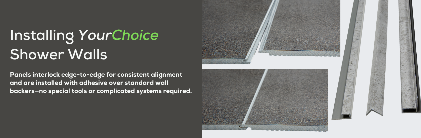 YourChoice Shower Wall Panels can be installed over tile or on to substrates like; Cement Board, Schluter Kerdi Board, GP Denshield, Johns Manville Go Board, Hardiebacker, WPBK Triton, Fiberock, and equivalent products.